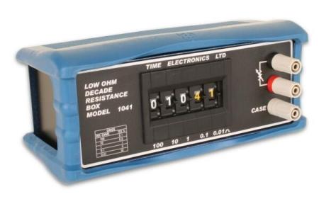 Time Electronics 1041 är en precis lågohmig resistansbox designad för allmänt laboratoriearbete, inklusive platinamotståndstermometri. 1041 är kompakt och hållbar, inrymd i ett robust metallhölje med avtagbart skyddande gummifodral, vilket gör den idealisk för användning både i laboratoriet och ute på fältet. Utmärkt noggrannhet uppnås genom användning av högstabila metallfilmsresistanser. Den 5-siffriga tumhjulsväljaren möjliggör enkel och precis inställning med en tydlig indikation av resistansvärdet.