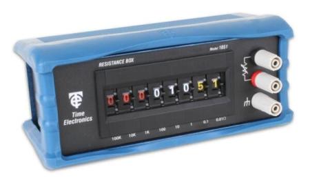 Time Electronics 1051 är en precis lågohmig resistansbox designad för allmänt laboratoriearbete, inklusive platinamotståndstermometri. 1051 är kompakt och hållbar, inrymd i ett robust metallhölje med avtagbart skyddande gummifodral, vilket gör den idealisk för användning både i laboratorium och ute på fältet. Utmärkt noggrannhet uppnås genom användning av högstabila metallfilmsresistanser. Den 8-siffriga tumhjulsväljaren möjliggör enkel och precis inställning med en tydlig indikation av resistansvärdet.