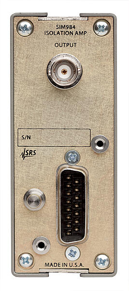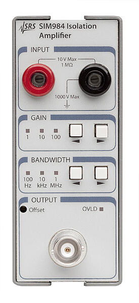 SIM984 är en isoleringsförstärkare med bred bandbredd och låg brus. Den har en förstärkning på upp till x100 och en bandbredd på upp till 1 MHz. Ingångssteget är flytande och är optiskt kopplat till utgångssteget som är chassijordat. Insignalen kan flyta upp till 1000 V över eller under jord. DC-utgångsoffset kan justeras från frontpanelen med en liten skruvmejsel. Förutom att mäta isolerade signaler, kan SIM984 även användas för att bryta jordslingor och minska common-mode-störningar.