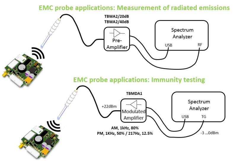 Ytterligare applikationer är RF-immunitetstester genom att mata en RF-signal in i proben och utsända den till potentiellt känsliga kretssektioner: Dessutom kan proberna användas inom området för reparation eller felsökning för att spåra problem i RF-signalkedjor genom kontaktlös mätning av RF-signal nivåer.