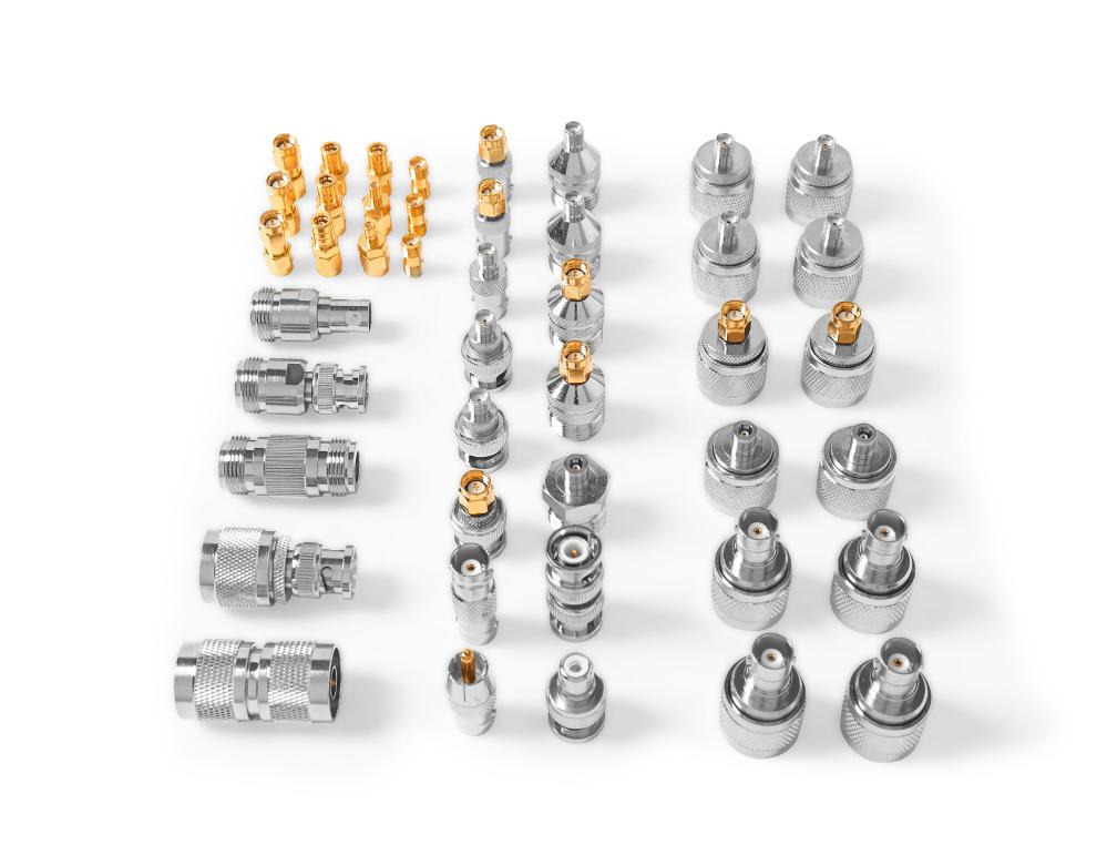 Koaxialadapterset med 44 st 50 Ω adaptrar, N-, SMA-, BNC-, SMB- och RCA-kombinationer i förvaringslåda, för RF- och HF-mätapplikationer.