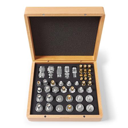 TBCAS1 koaxialadapterset består av 44 adaptrar av de vanligaste 50 Ohm Koaxialadaptrarna i en snygg låda av bokträ som håller ordning på alla adaptrarna.