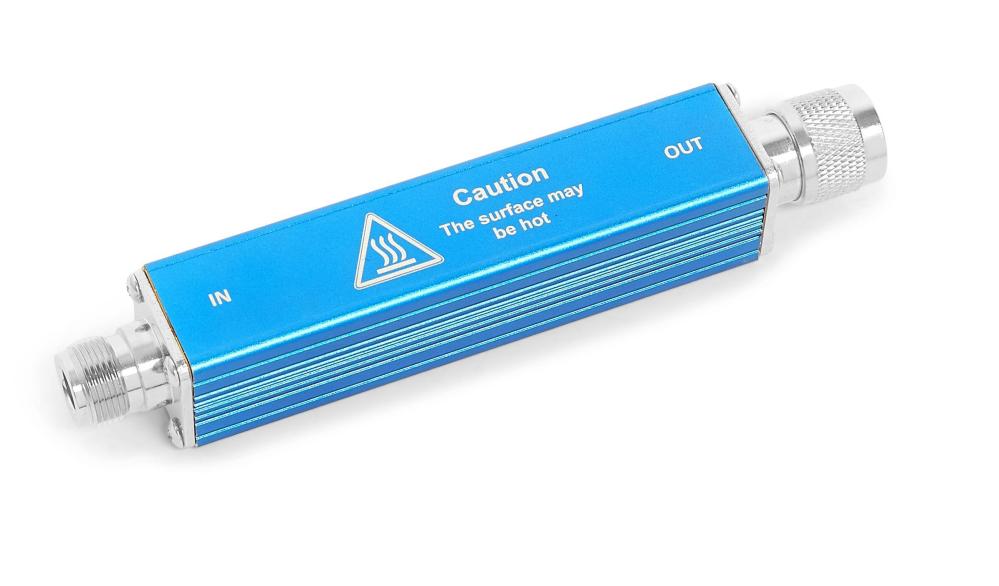 Transientbegränsare med 10 dB dämpning, 9 kHz–600 MHz, begränsningströskel +11 dBm, max 5 W kontinuerlig RF-effekt och integrerat 9 kHz högpassfilter, N-hona till N-hane.