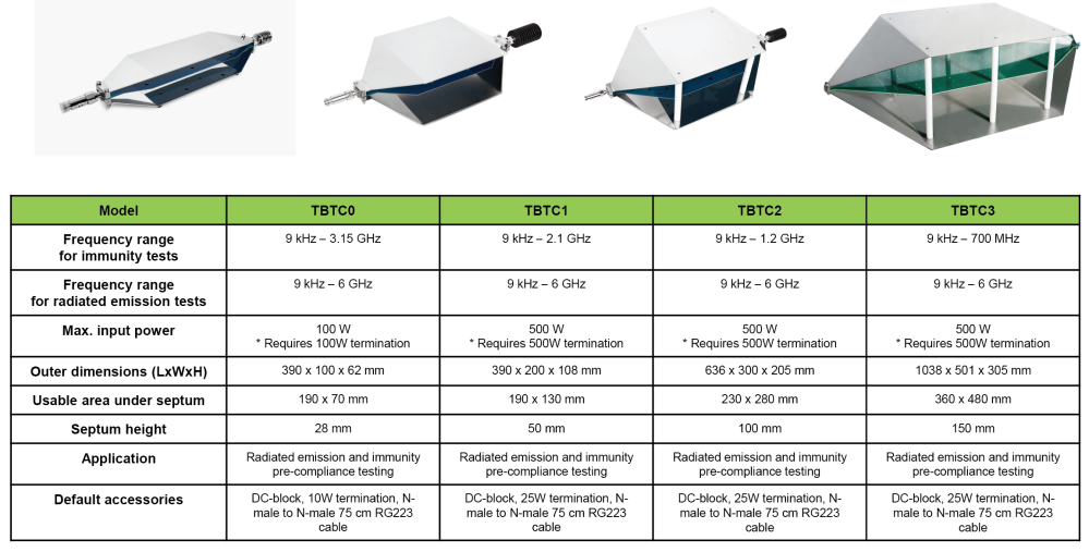 TBTC2 är en så kallad "öppen TEM-cell", som inte har några sidoväggar för bekväm placering av DUT. Den kan ta upp RF-bakgrundsbrus, vilket dock kan tas i beaktande genom att göra en mätning av cellutgångssignalen innan du slår på DUT.