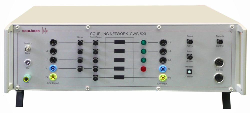 3-fas kopplings-/avkopplingsnätverk för burst- och surge-test enligt IEC 61000-4-4/-4-5, upp till 16 A, med omkopplingsbara kopplingsvägar och RS232-gränssnitt för fjärrstyrning.