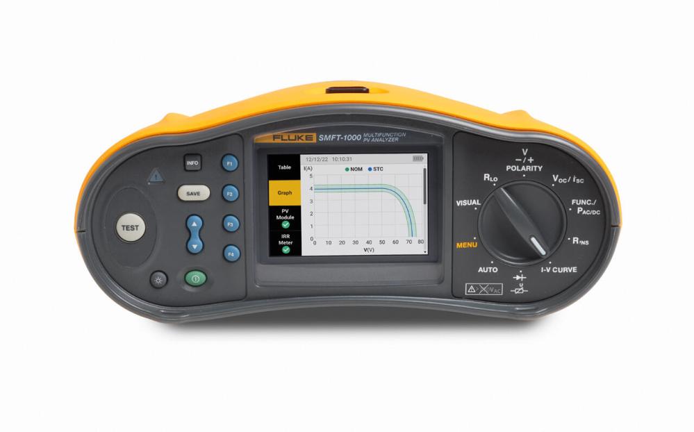 Testa att PV-system presterar med sin optimala effekt och fungerar säkert med Fluke SMFT-1000 multifunktionstestare med I-V-kurvspårning (Figur 1). SMFT-1000 är designad för PV-proffs som tillhandahåller installation, driftsättning och underhållstjänster till system som arbetar vid 1 000 V DC eller lägre, och tillhandahåller en komplett PV-testlösning som överensstämmer med IEC/EN 62446-1- standarderna. Genom Flukes TruTest™-programvara kan mätdata från solcellsinstallation och idrifttagningstestning enkelt importeras, organiseras och analyseras för enkel rapportering utan att behöva ta med en bärbar dator på plats.