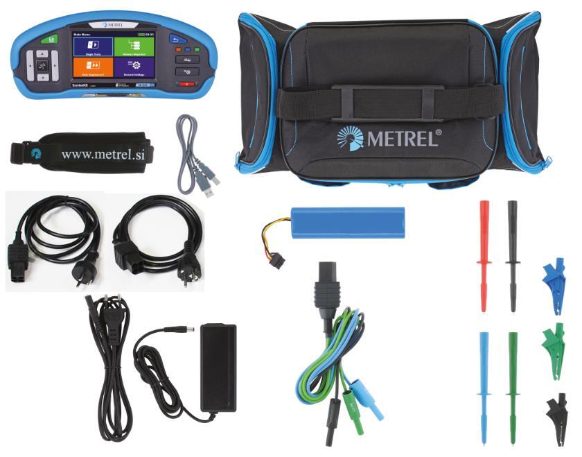 Levereras i en väska inkl. uppladdningsbart batteri, laddare, nackrem, universalkabel A1011, testledning med Schuko kontakt, 3 st krokodillklämmor, 4 st testpinnar och manual, samt USB kabel och Svensk programvara ES Manager.