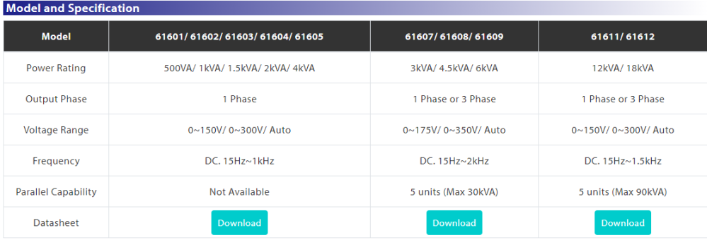 • 61602 AC Source 0~300V, 15~1kHz / 1KVA, 1ø
