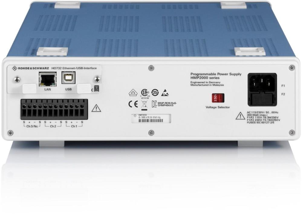 R&S®HMP-strömförsörjningen är utrustad med ett dubbelt USB/LAN-gränssnitt som standard.