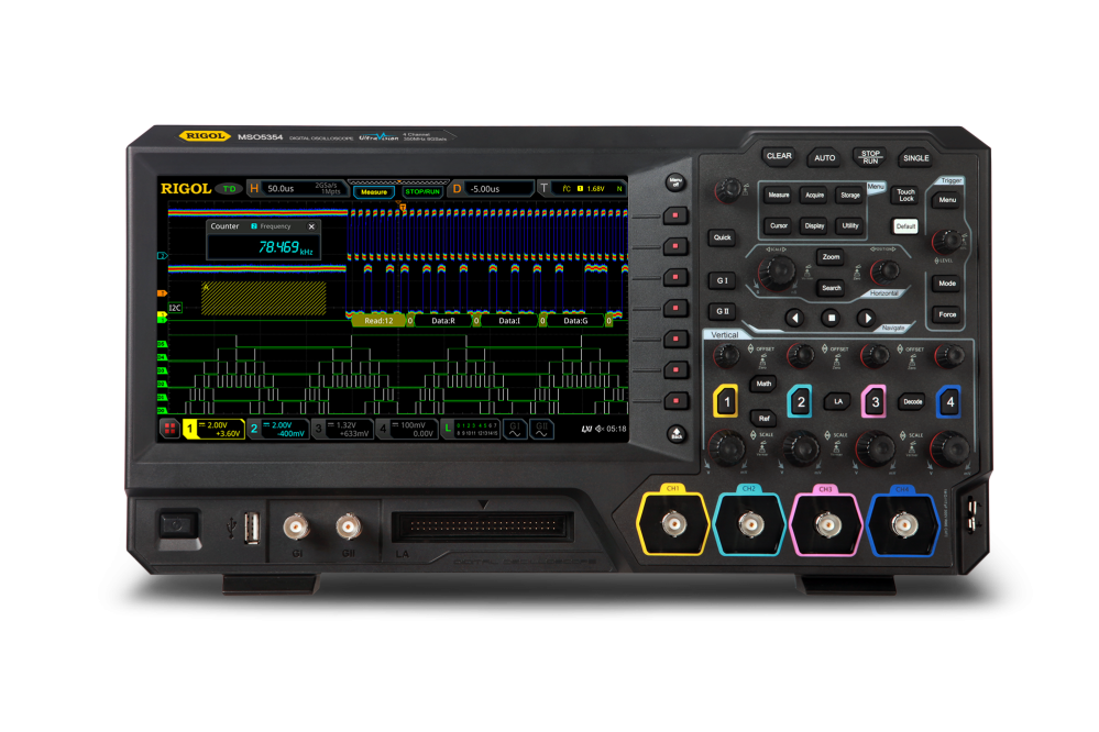 Det nya digitala oscilloskopet i MSO5000-serien som lanserades av RIGOL denna gång integrerar 7 oberoende instrument i ett, inklusive ett digitalt oscilloskop, en 16-kanals logikanalysator, en spektrumanalysator, en godtycklig vågformsgenerator, en digital voltmeter, en högprecisionsfrekvensräknare och totaliserare och en protokollanalysator.