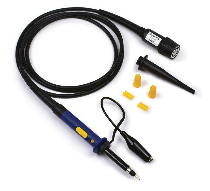 Passiv 1:1/10:1 oscilloskopsprob med 100 MHz bandbredd, BNC-anslutning, omdesignad probspets för utbytbara spetsar och förbättrad hållbarhet.