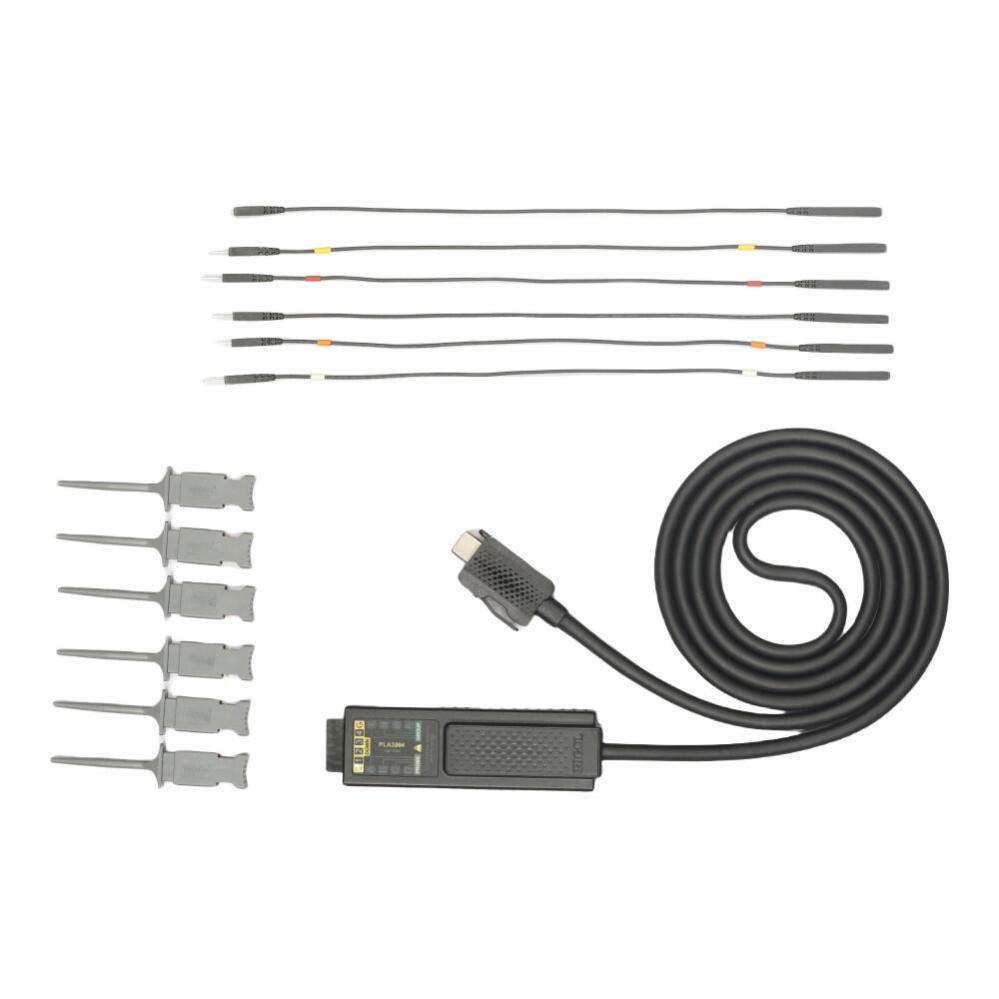 Som en högpresterande 4-kanals aktiv logikprobe ansluter PLA3204 digitala signaler från systemet som testas till RIGOL MHO/DHO5000-seriens digitala oscilloskop via dess USB Type-C-kontakt, vilket möjliggör logikanalysfunktionen. PLA3204 innehåller 4 datakanaler och 8 jordkanaler. På probhuvudets etikett är alla datakanaler markerade med siffror så att du kan identifiera olika kanaler. PLA3204 levereras dessutom som standard med 4 signalkablar och 2 jordkablar för flexibla anslutningar till den signal som testas och referensjorden.