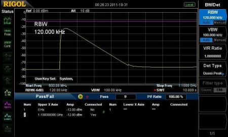 DSA800-EMI-alternativet tillhandahåller Quasi-Peak-detektor och EMI-filter (200 Hz, 9 kHz, 120 kHz, -6 dB bandbredd).