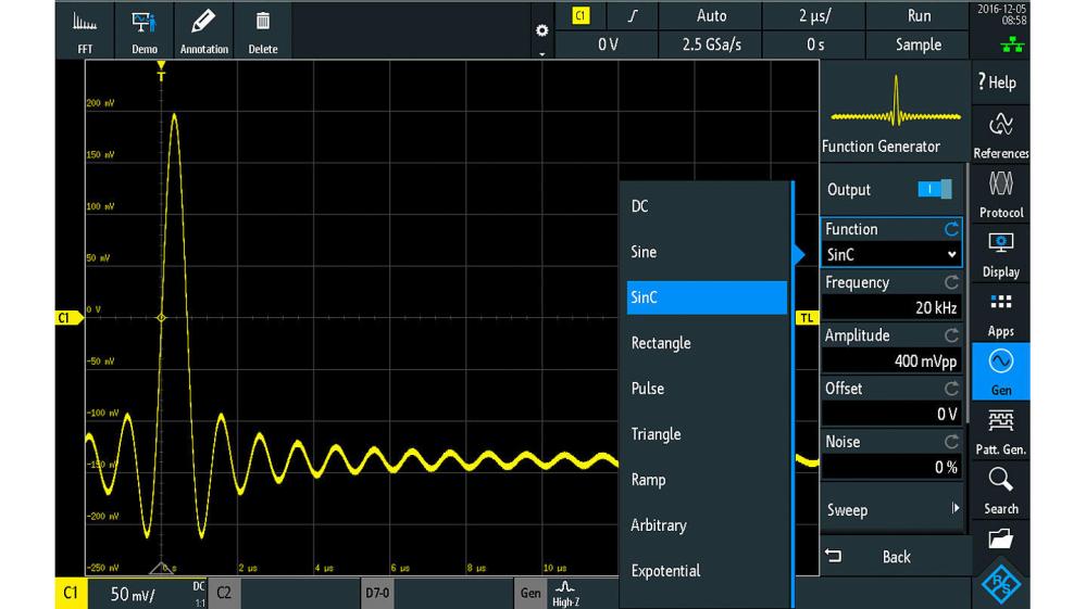 Den integrerade R&S®RTB-B6-vågformen och mönstergeneratorn upp till 50 Mbit/s är användbar för utbildningsändamål och för att implementera prototyphårdvara.
