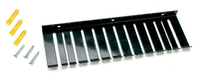 Väggmonterad hållare för mätledningar med separata rader för BNC-, 2 mm- och 4 mm-kablar, metallutförande med 26 cm bredd för organiserad förvaring.