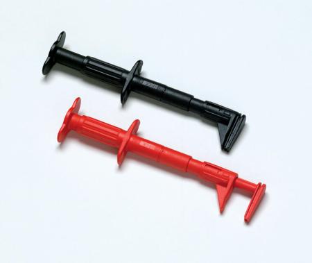 Extra kraftiga samlingsskeneklämmor i rött och svart med platt, vinklat utförande, ställbar öppning upp till 30 mm och märkning CAT III 600 V, 5 A.