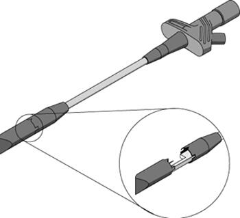 Vampyrklämma som sticker igenom isolerade kablar 0,25–1,5 mm med fin nål för minimal skada och självläkning, klassad CAT IV 600 V / CAT III 1000 V, 5 A.