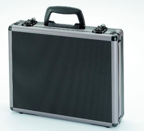 Robust metallväska med utskuret anpassningsbart skum för säker förvaring av mätinstrument och tillbehör. Invändiga mått 270 × 195 × 65 mm.